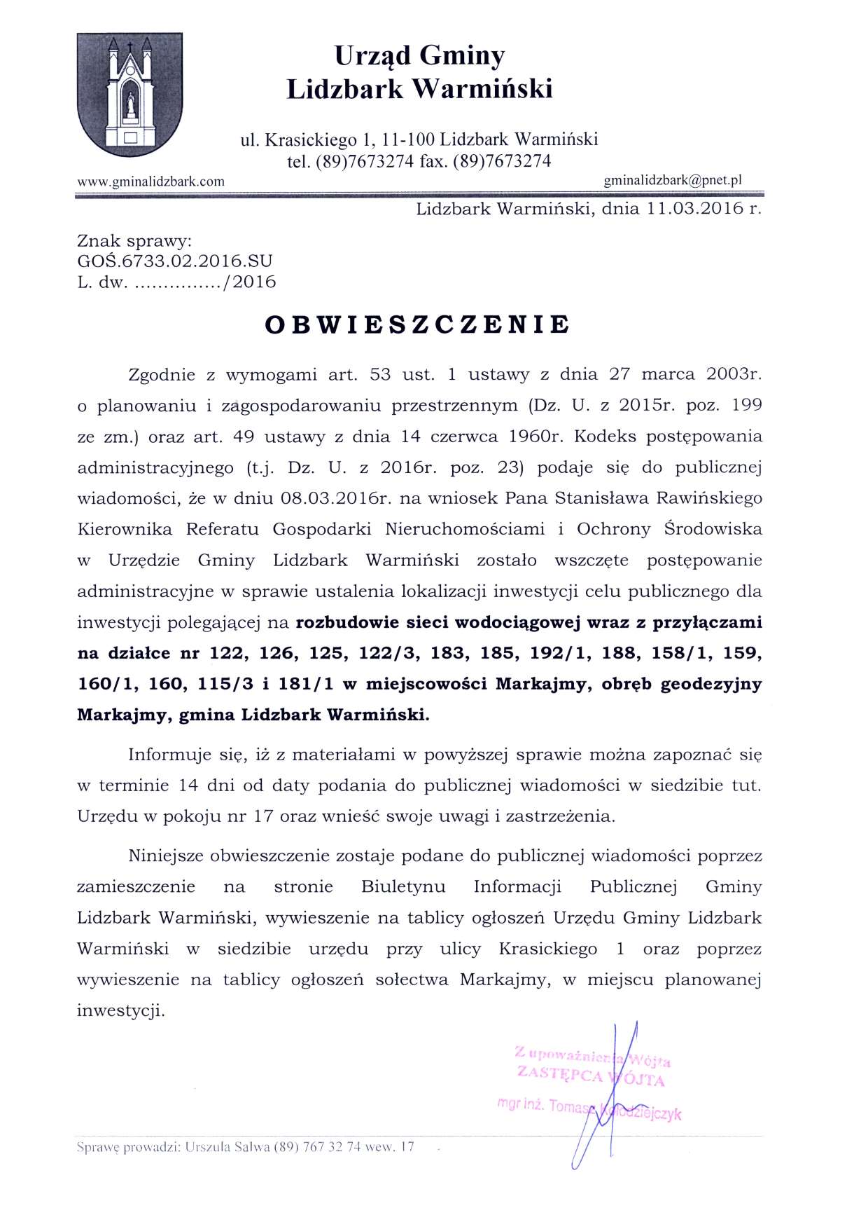 Obwieszczenie o wszczeciu postępowania w sprawie ustalenia lokalizacji celu publicznego - rozbudowa sieci wodociągowej wraz z przyłaczami - obręb Markajmy