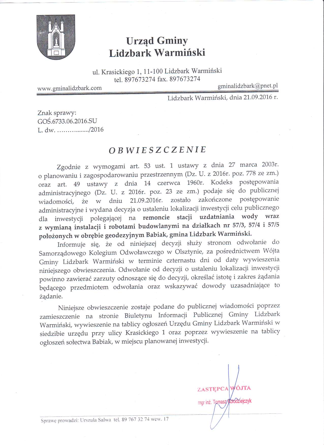 Obwieszczenie o zakończeniu postępowania w sprawie ustalenia lokalizacji celu publicznego - remont stacji uzdatniania wody - obręb Babiak