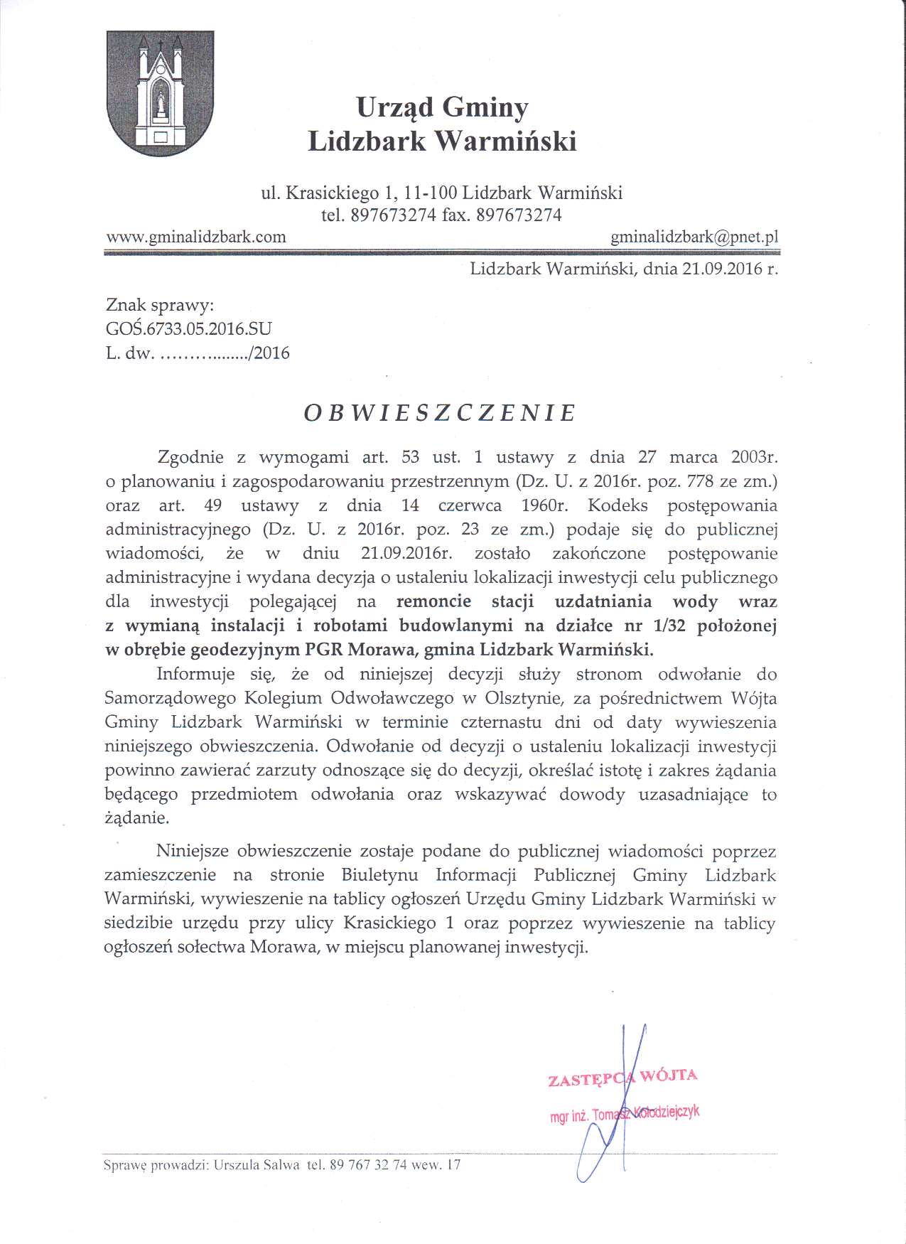 Obwieszczenie o zakończeniu postępowania w sprawie ustalenia lokalizacji celu publicznego - remont stacji uzdatniania wody - obręb Morawa