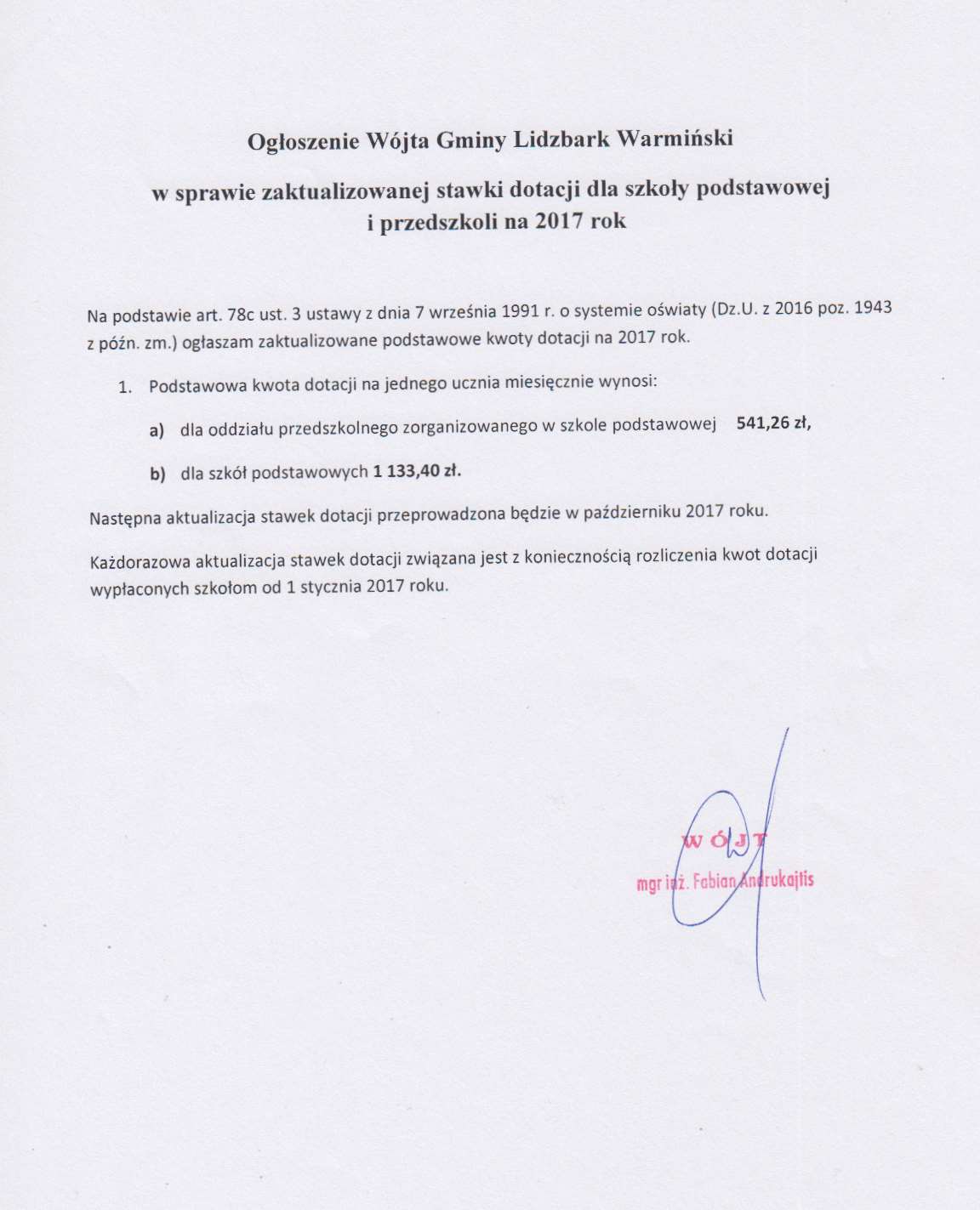 Wersja obowiązująca z dnia 22-05-2017 13:08:03 Drukuj Ogłoszenie Wójta Gminy Lidzbark Warmiński w sprawie zaktualizowanej stawki dotacji dla szkoły podstawowej i przedszkoli Załączniki Ogłoszenie format: image/jpeg, rozmiar: 87.28 KB, data dodania: 22-05-2017 13:08:03