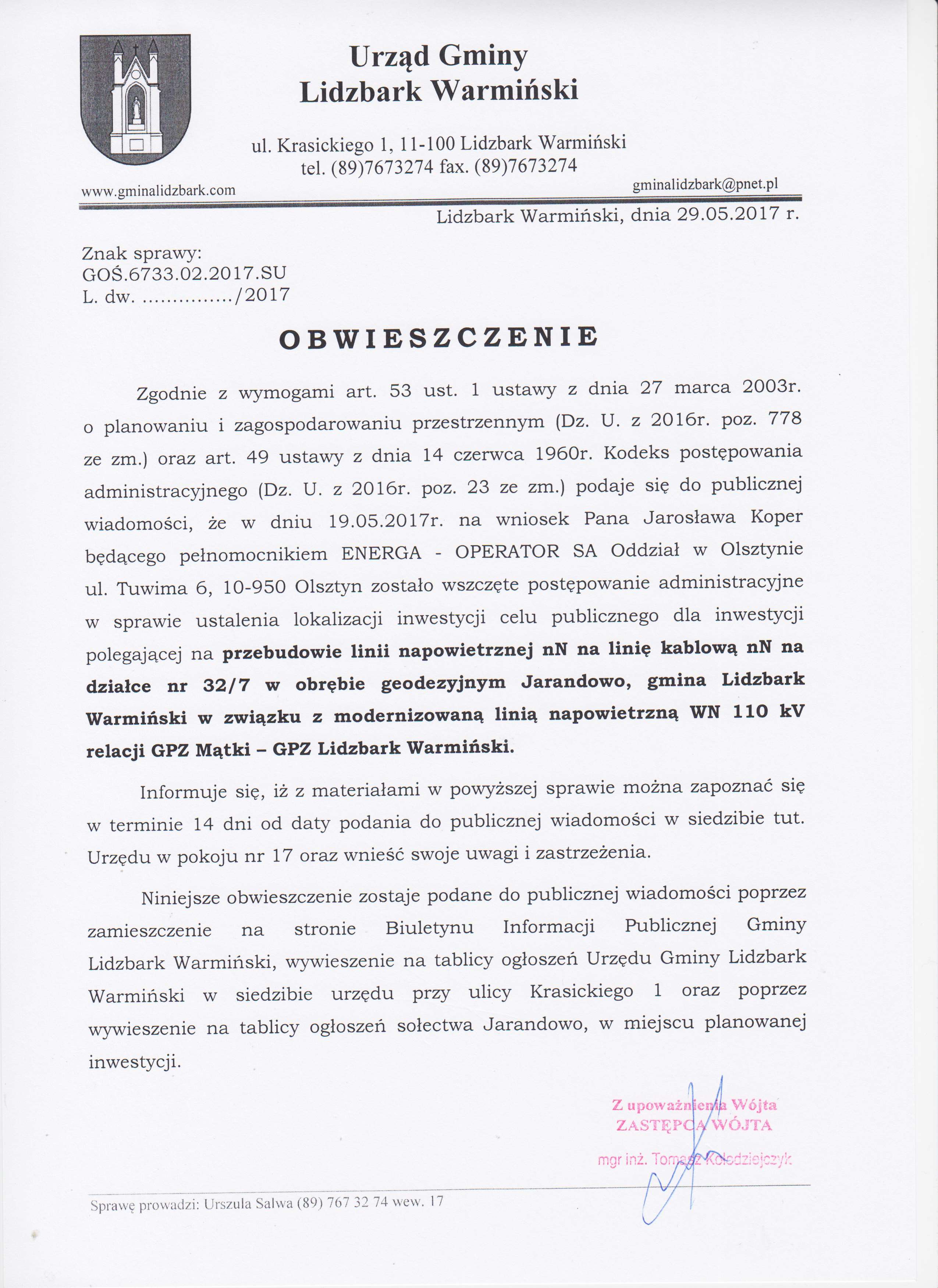 Wersja obowiązująca z dnia 31-05-2017 13:48:51 Drukuj Wszczęcie postępowania - przebudowa linii napowietrznej nN na linie kablową nN - obręb Jarandowo Załączniki Obwieszczenie 29.05.2017_1 format: image/jpeg, rozmiar: 599.29 KB, data dodania: 31-05-2017 13:47:15