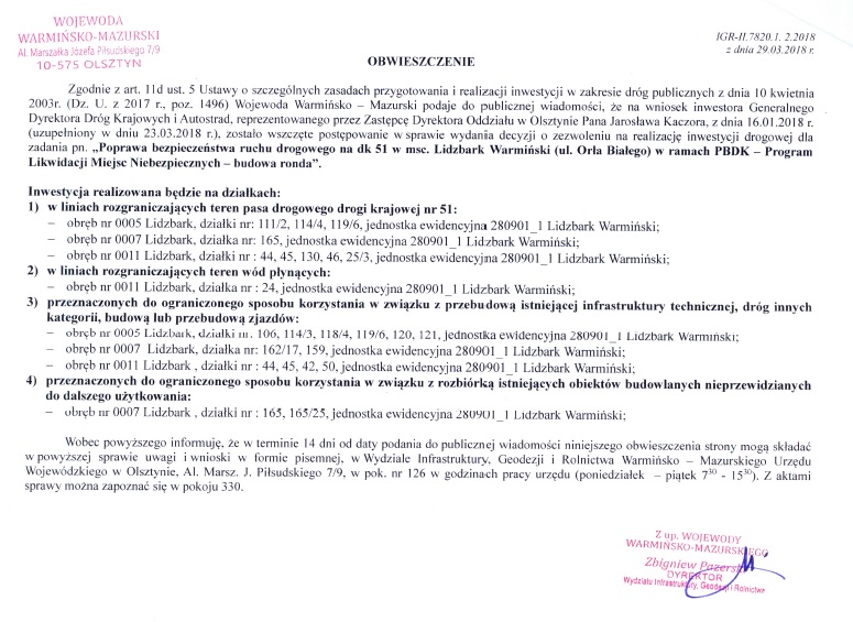 Obwieszczenie - wszczęcie postępowania w sprawie wydania decyzji o zezwolenie na realizację inwestycji drogowej dla zadania pn. "Poprawa bezpieczeństwa ruchu drogowego na dk 51 w msc. Lidzbark Warmiński (ul. Orła Białego) w ramach PBDK - Program Likwidacji Miejsc Niebezpiecznych - budowa ronda".