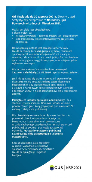 Zgodnie z ustawą o statystyce publicznej udział w Narodowym Spisie Powszechnym Ludności i Mieszkań 2021 jest obowiązkowy.