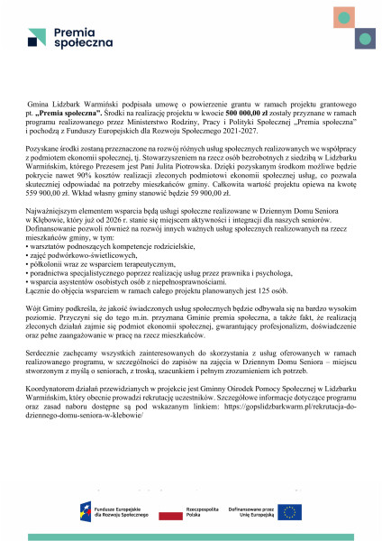 Wersja obowiązująca z dnia 17-12-2025 09:48:46 Drukuj Gmina Lidzbark Warmiński podpisała umowę o powierzenie grantu w ramach projektu grantowego pt. „Premia społeczna”. Załączniki Premia społeczna po podpisaniu umowy format: image/jpeg, rozmiar: 869.19 KB, data dodania: 17-12-2025 09:48:46