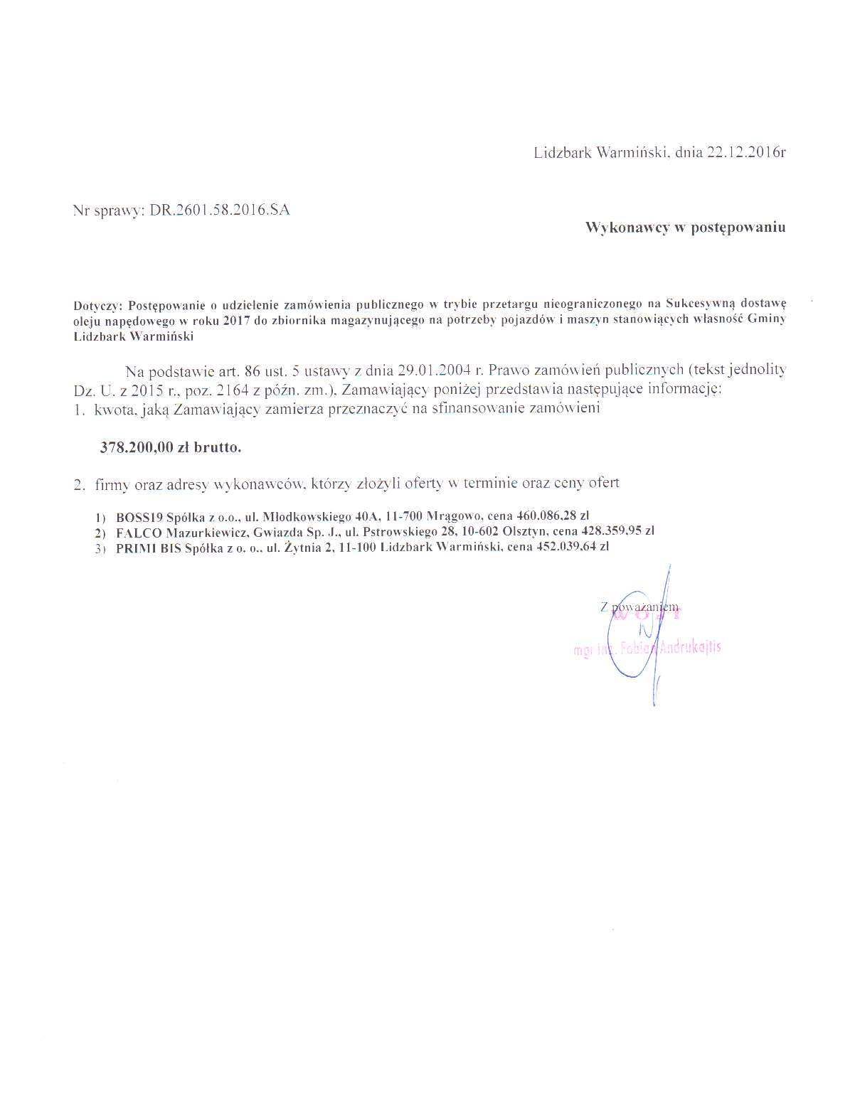 Sukcesywna dostawa oleju napędowego w roku 2017 do zbiornika magazynującego na potrzeby pojazdów i maszyn stanowiących własność Gminy Lidzbark Warmiński