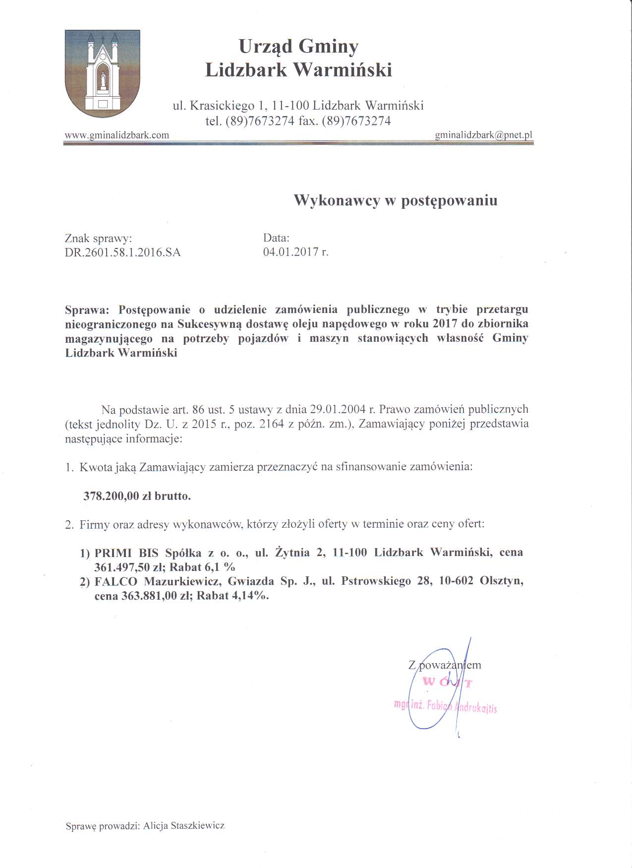 Sukcesywna dostawa oleju napędowego w roku 2017 do zbiornika magazynującego na potrzeby pojazdów i maszyn stanowiących własność Gminy Lidzbark Warmiński