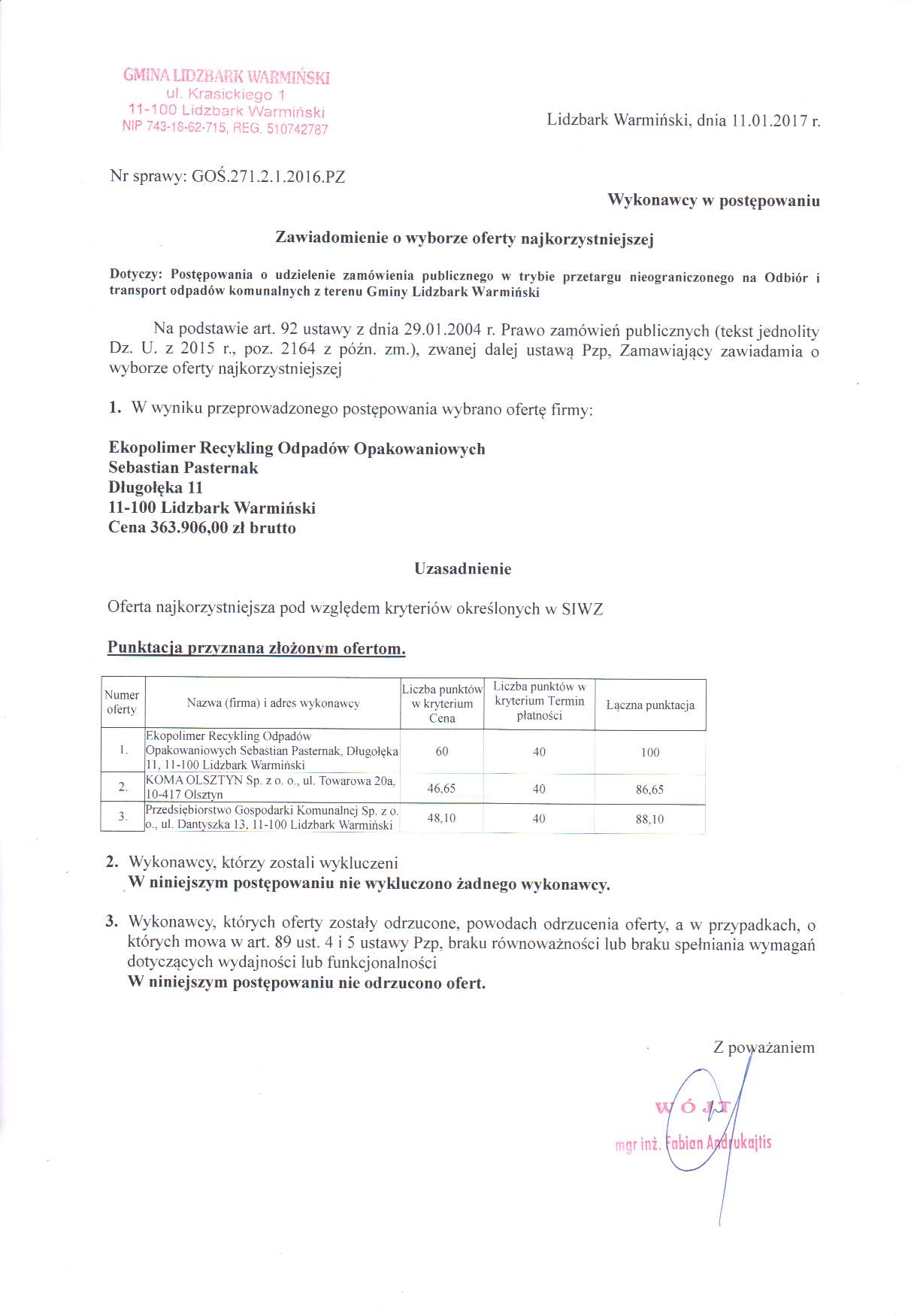 Zawiadomienie o wyborze najkorzystniejszej oferty