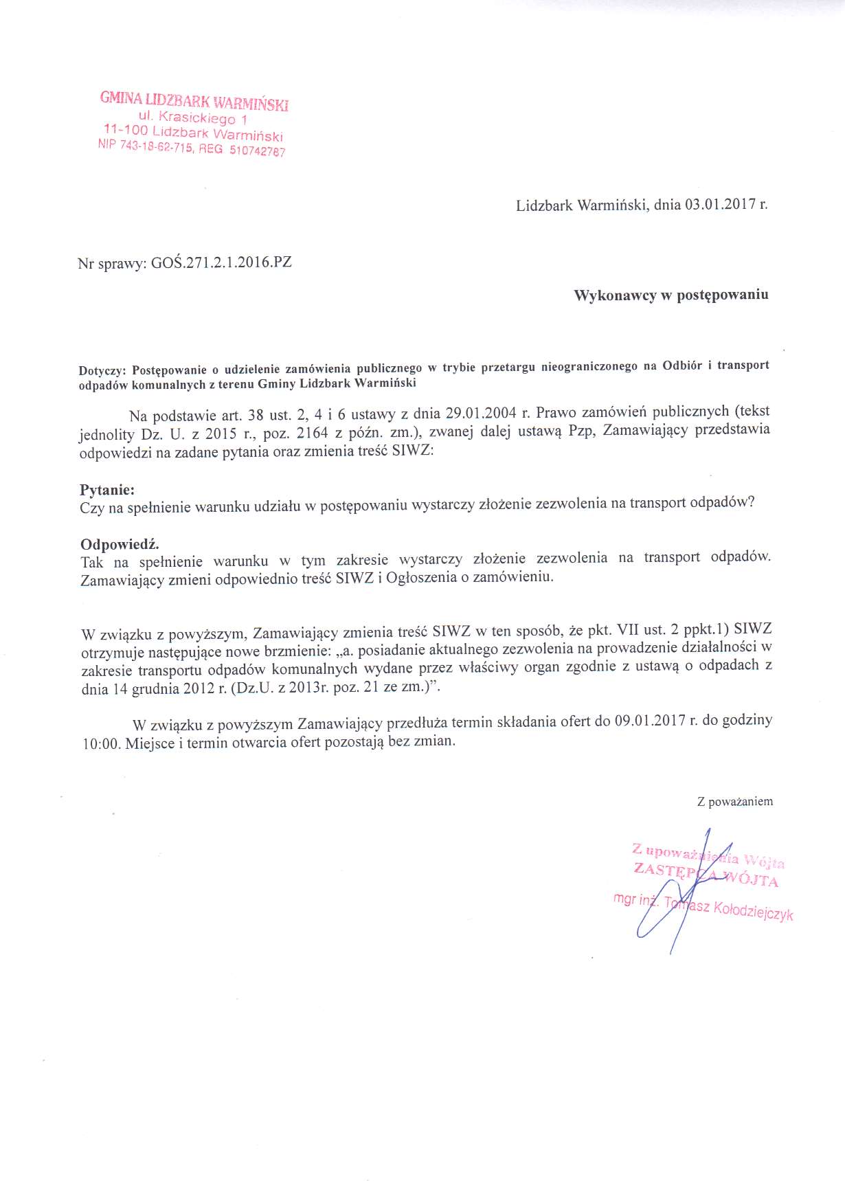 Odpowiedz na pytanie i zmiana SIWZ